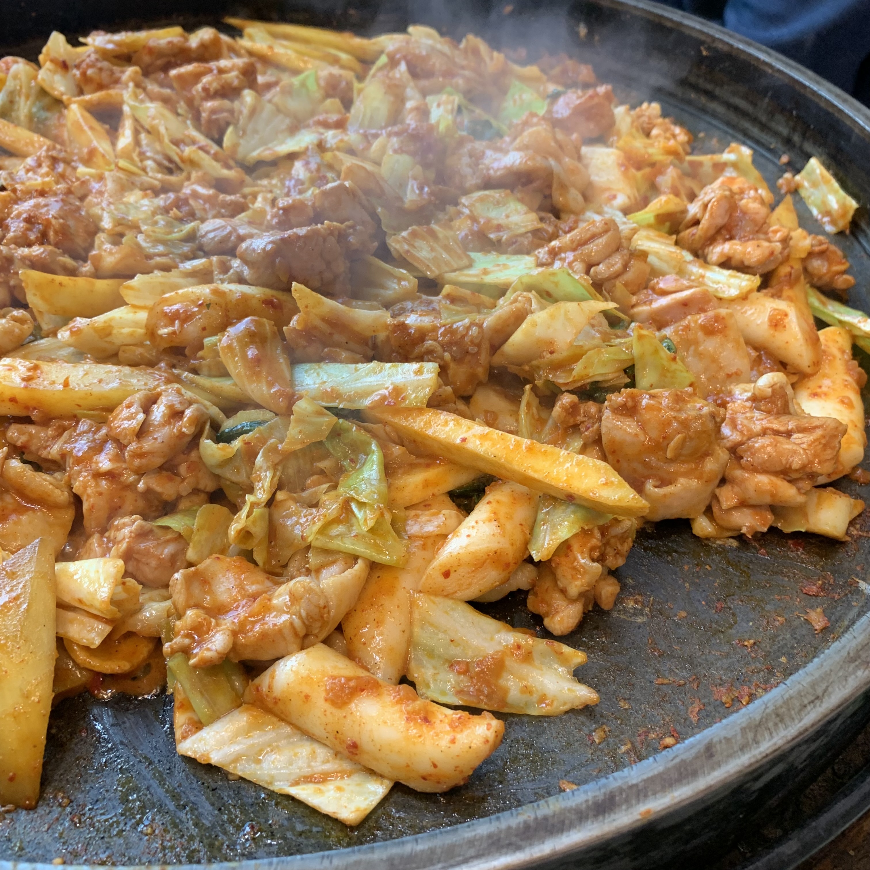 - クラシックな炒めスタイル:鶏肉、キャベツ、サツマイモ、玉ねぎ、トッポッキを辛いタレで一緒に炒める伝統的な食べ方。